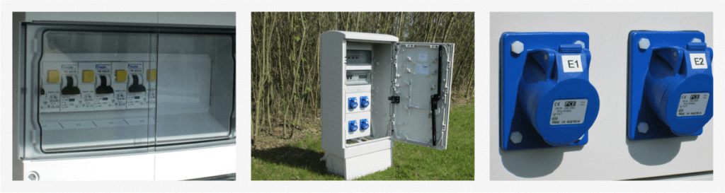 Die Campingplatzverteiler sind je Steckdose mit FI/LS-Kombinationen und Rollen– oder LCD-Zähler bestückt. Für die pauschale Abrechnung entfällt die Ausrüstung mit Zählern. Als Hauptschalter und Vorsicherung kommt ein Sicherungslasttrenner mit optischer Sicherungsüberwachung zum Einsatz.